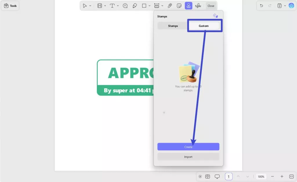 - Select the Import Option: Within the stamp options, look for an "Import" button in "Custom" section. This function enables you to browse and select a stamp image file from your computer. Supported formats typically include PNG, JPEG, and other common image types, ensuring compatibility with most stamp designs.