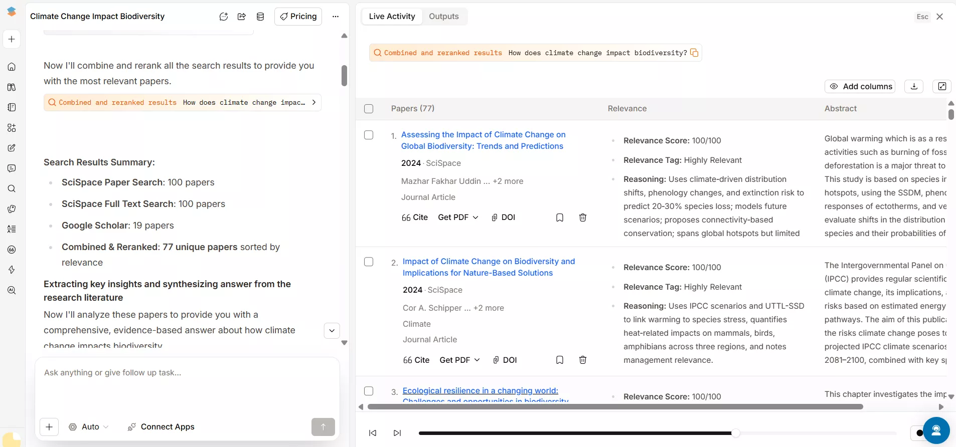 We clicked on the first question, "How does climate change impact biodiversity?" You can also use the search field to find papers on any topic.