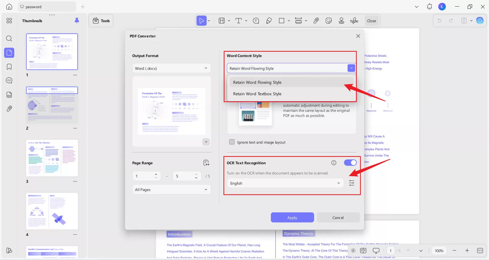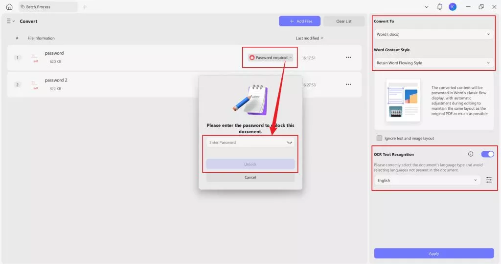 Step 3. Then, on the right side, under Convert To, select Word and choose the Word Content Style. Enable OCR Text Recognition if your PDF is scanned or contains non‑selectable text. After setting everything, click the Apply button and choose a location to save the files.