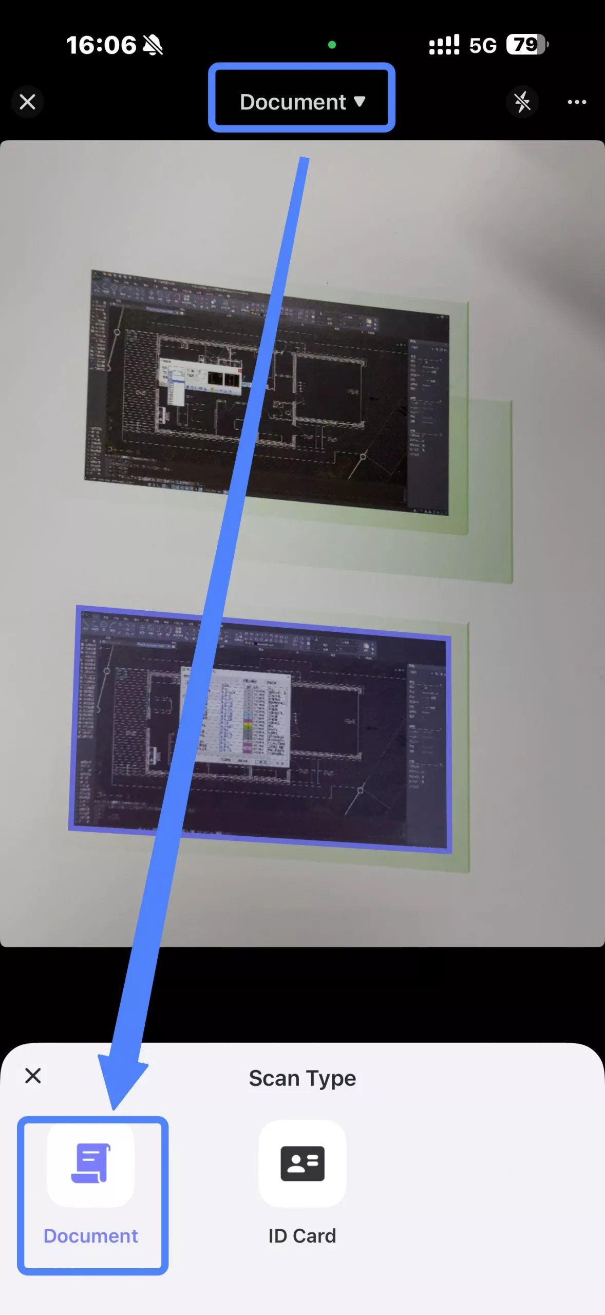 Step 2. Click on the drop-down icon at the top and select the type of document you will be scanning. You are given the options to choose between "Document" and "ID Card".