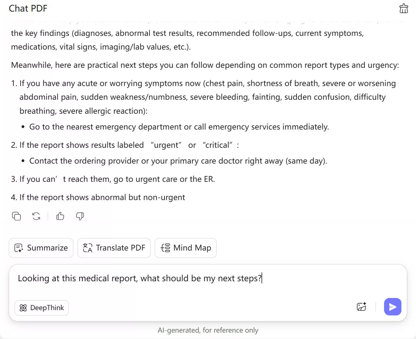There is a dedicated "Ask PDF" mode within the AI that can analyze medical reports and address your queries. After analyzing, it will automatically provide a quick summary of the whole report.